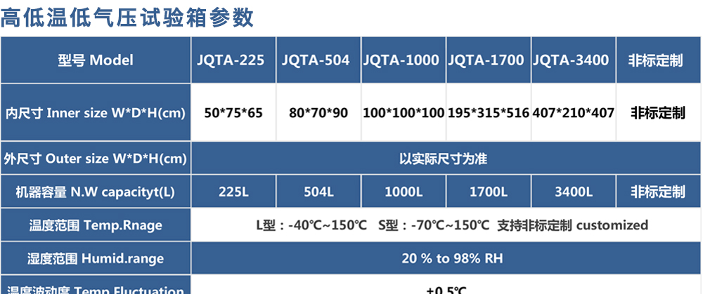 產(chǎn)品型號:JQTA-504 品牌:劍 喬 用途:高低溫低氣壓試驗(yàn)箱,簡稱低氣壓試驗(yàn)機(jī)、低氣壓(高度)試驗(yàn)箱、高低溫濕熱低氣壓試驗(yàn)箱,適用于電工、電子產(chǎn)品及其他產(chǎn)品、零部件及材料進(jìn)行低氣壓試驗(yàn)的環(huán)境試驗(yàn)箱設(shè)備,可滿足電工咨詢熱線:13829135130
